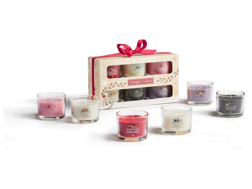 Nádherná dárková sada s šesti vůněmi v provedení skleněná votivní svíčka: nové vánoční vůně Snow Globe Wonderland, Snowflake Kisses, Peppermint Pinwheels a unikátní vůně, které v jiném provedení nemáme: White Spruce & Grapefruit (citrusy, ananas, balzámová jedle, smrk), Silver Sage & Pine (šalvěj, borové jehličí, kůže, jasmín) a Smoked Vanilla & Cashmere (černý rybíz, mashmallow, skořice, vanilka a pižmo).